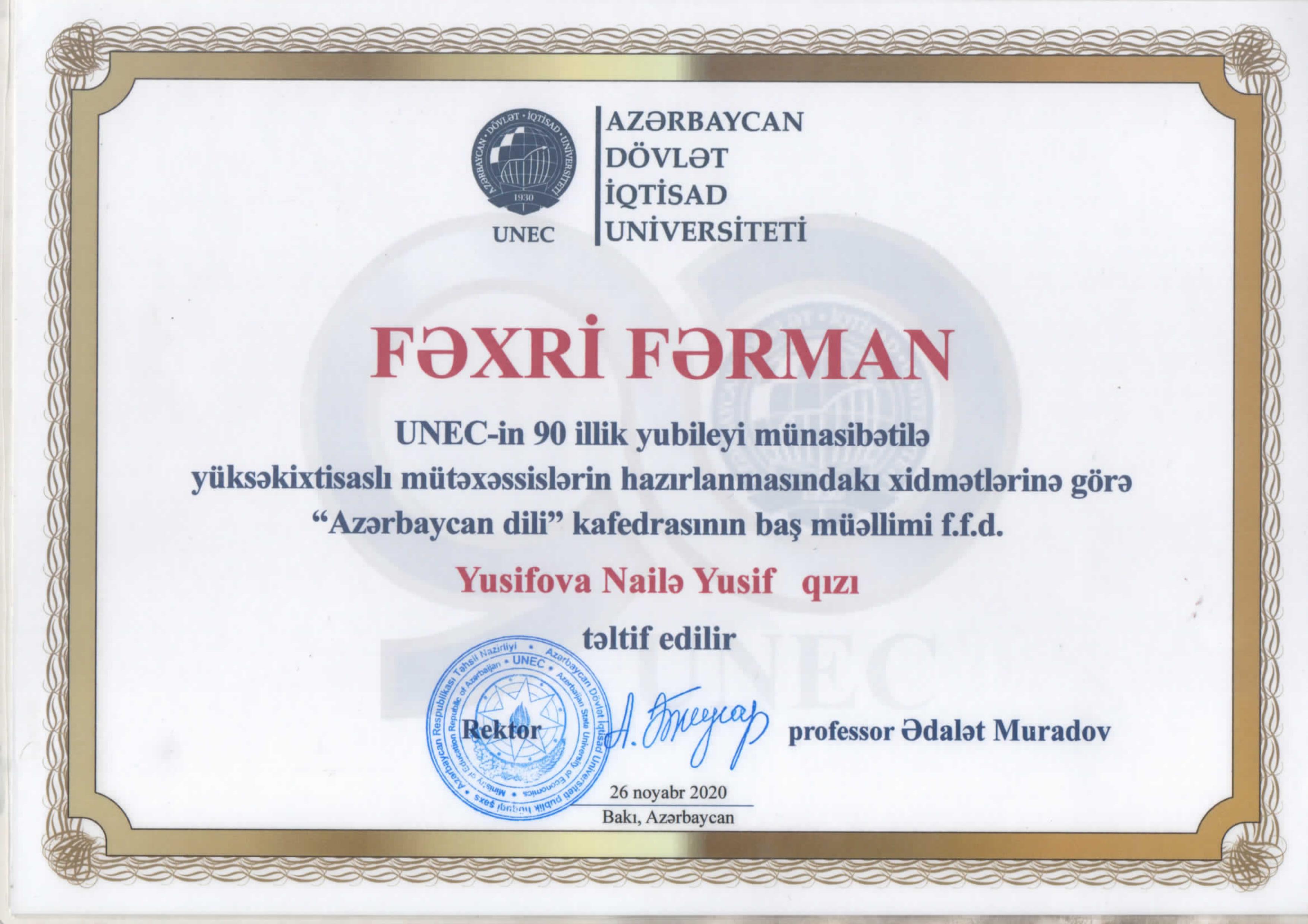 2020-ci ildə yüksək ixtisaslı mütəxəssislərin hazırlanmasındakı xidmətləri nəzərə alınaraq, UNEC-in 90 illik yubileyi münasibətilə Fəxri Fərmanla mükafatlandırılıb.